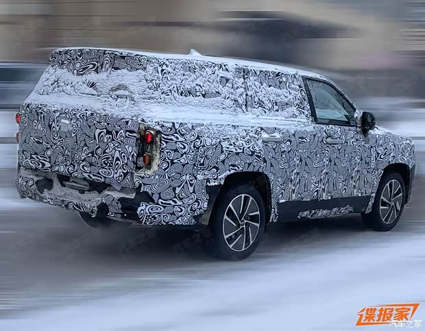 从效果图也可以看出,新车采用三排的座椅的设计,并且车尾还采用了天地门的设计,后保险杠还有一个脚踏踏板,与谍照车型完全一致。该车型尾部有排气排出,证实它会是一款燃油车型或者是混动车型。